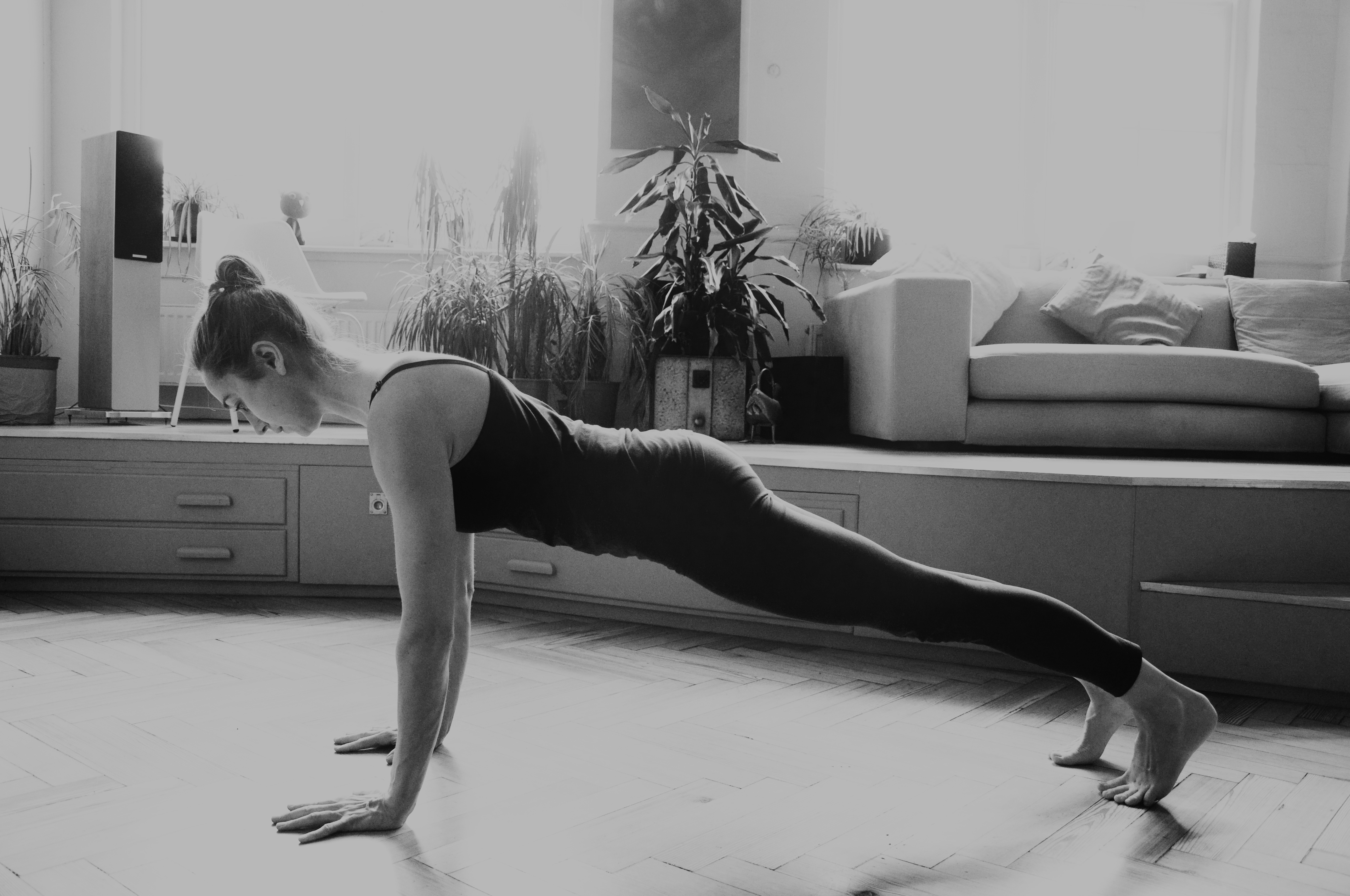 • Spread your hands as wide as possible – the bigger the better! Imagine your hands are glued to the floor but everything else in your body is trying to stand up – this avoids collapsing towards the floor