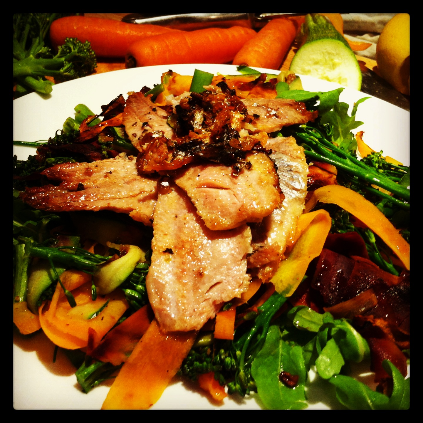 Dress a plate with a handful of rocket, add the cooked veg then place the sardines on top – make sure if there is any leftover juice in the pan to pour it over the veg. Enjoy!