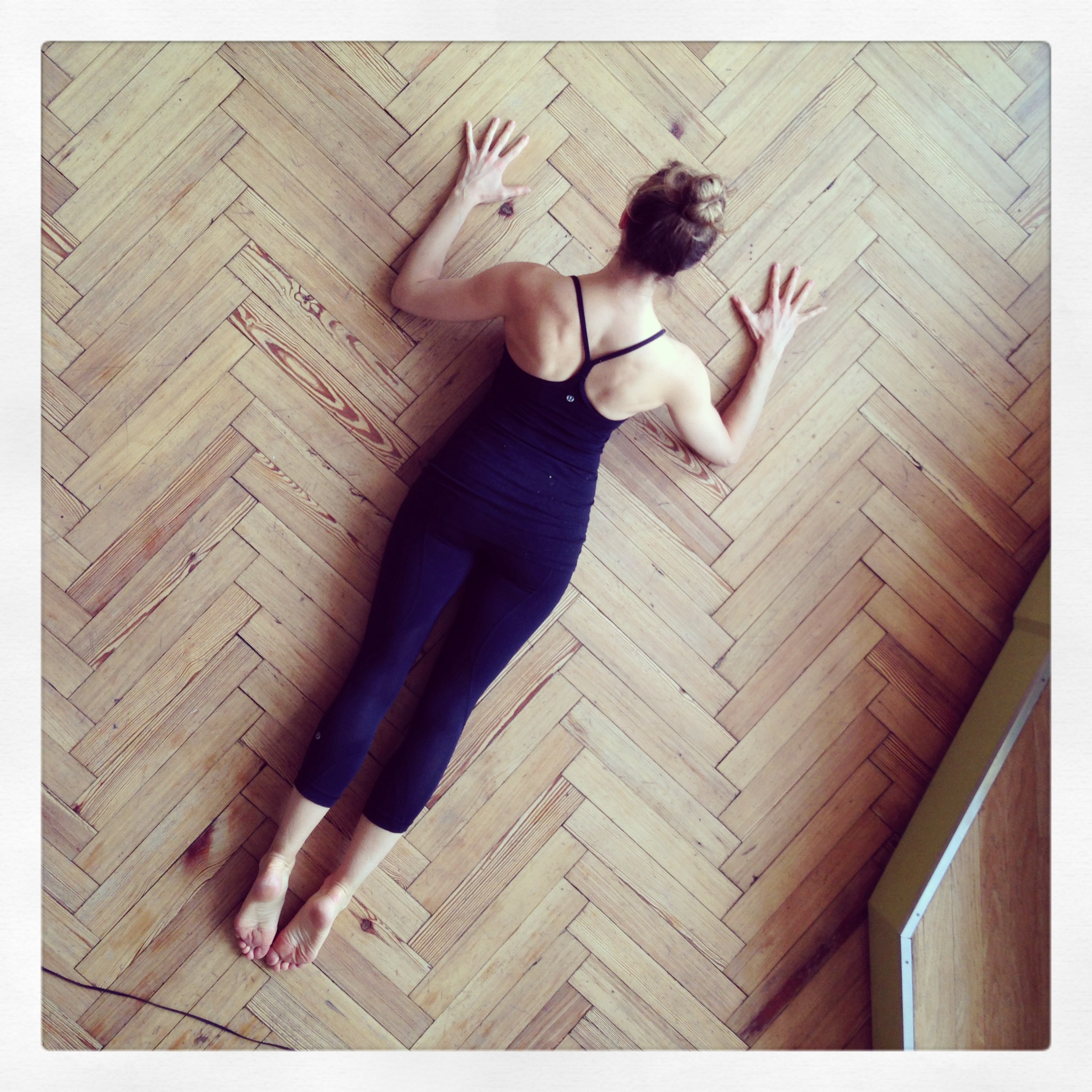 Really emphasise the exhale – you should hear the breath being blown out through your mouth and see your belly sinking back towards your spine. Keep shoulders soft and collarbones wide. Feel the middle to lower spine gently massaging into the floor, stretch open through the back of the leg that is pulled towards you and the front of the hip of the leg stretching away. Think of the reaching the crown of your head and your toes up to the ceiling – always think of making space throughout every joint, avoid compressing and tensing.