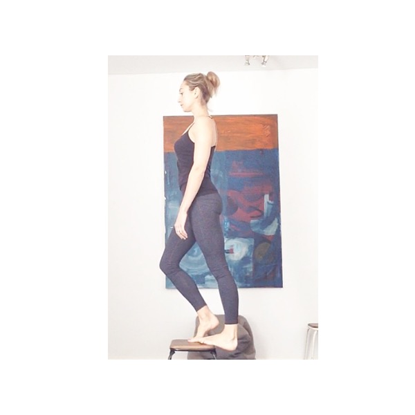 - Stand the front of your feet on the edge of a step, rise up onto your toes and alternate dropping your heels down off the step for one minute (keep your feet pointing forward, eye line level, draw belly into spine and reach the crown of your head to the sky)